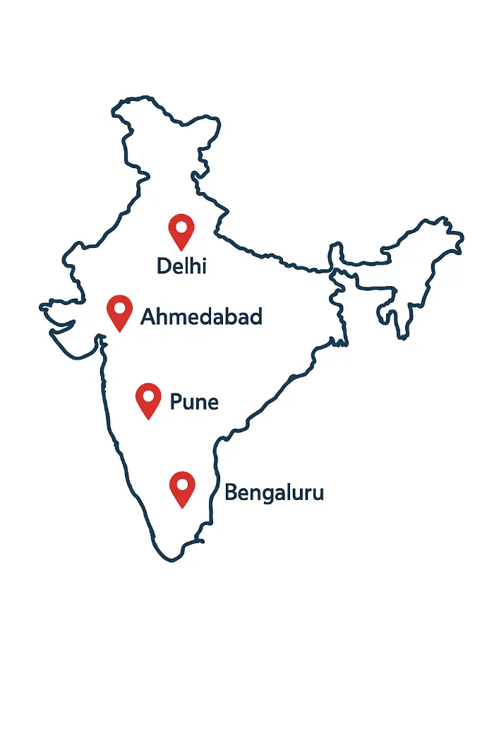 With branches in Bengaluru, Ahmedabad, Delhi, and Pune, our reach spans across India. No matter where a business or project is located, our team provides prompt service and full support.